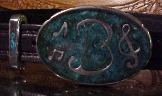 | Cast aluminum buckle and belt loop with inlaid turquoise and symbols Sold |